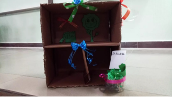 设计理念:模拟小书柜,贴上绿色的、微笑着的向阳花,结构简单分明,彩带装饰内外檐,真是“柜”上添花;外加绿色小盆栽,蔓延绿色气息。