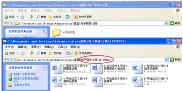 1.课题登记表;2.开题报告(任务书);3.指导记录;4.答辩记录;5.成绩单;6.毕业论文(设计)。文件整理示例: