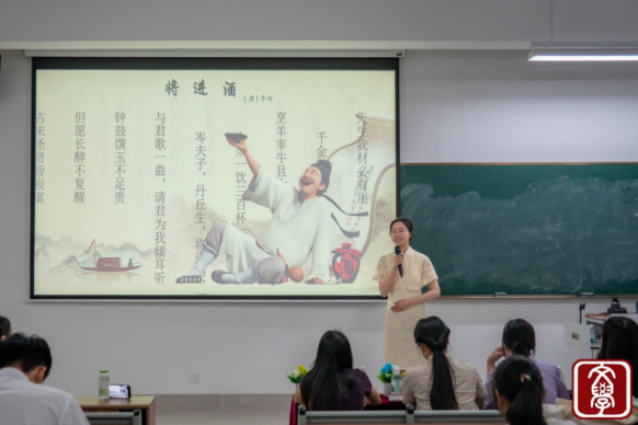 1号选手何佳漪携李白的《将进酒》率先登场,她以“天生我材必有用”的豪迈开篇,手势如酒酣挥墨,声调似江河奔涌,将诗仙“千金散尽还复来”的旷达酒脱诠释得淋漓尽致,让盛唐的酒酣诗兴在教室中激荡。