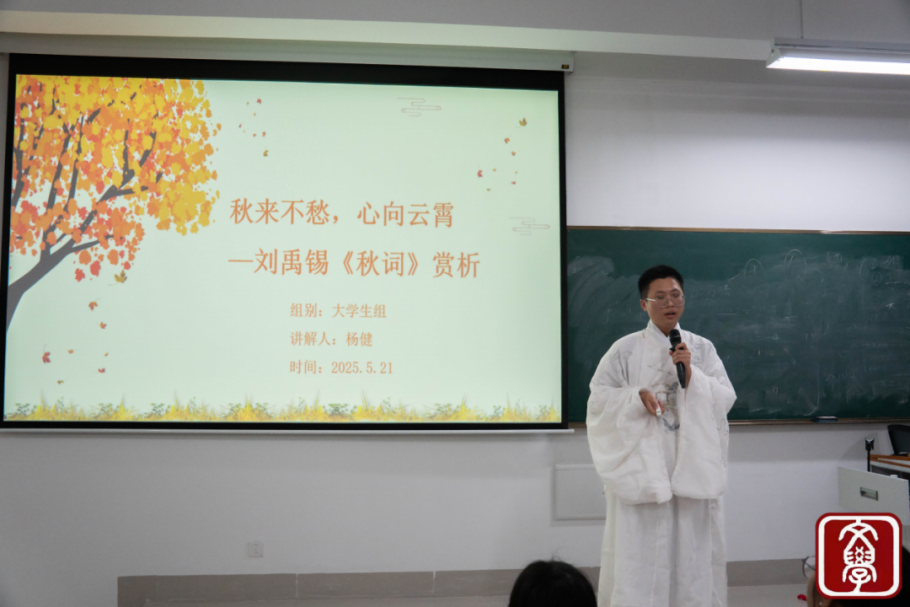 5号选手杨健精神饱满地走上讲台,开启对刘禹锡《秋词》的赏析之旅。他深入剖析诗句内涵,从“晴空一鹤排云上,便引诗情到碧霄”中挖掘出诗人积极向上的心境与对生活的热忱,生动的讲解仿佛让那振翅高飞的白鹤跃然眼前,把刘禹锡笔下秋的壮美与活力传递给现场每一位听众,带领大家沉浸在古典诗词的独特韵味之中。