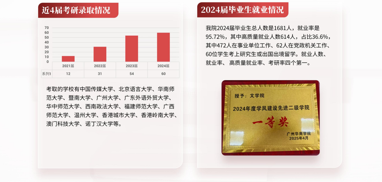 ·近4届学生考取中国传媒大学、北京语言大学、暨南大学等知名高校·2024届考研人数:54人(近三年持续增长)。