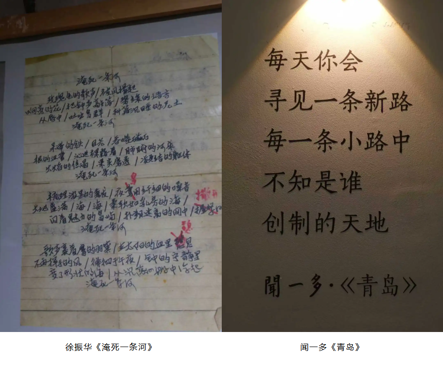 首先,走入地下一楼的文学放映室,空间里满是青岛的文学诗集。其中,《淹死一条河》的创作原稿引发学生和老师的热烈讨论。 随后,走进青岛文学馆一楼,映入眼帘的是闻一多先生的散文《青岛》的摘抄语录。经查阅深读《青岛》全文,我们能发现闻一多先生自然地将西方的唯美主义以及沉重的历史融入《青岛》全文,他不自觉地将东西方的文化差异在创作中进行比较与区分。这不仅体现了外国文学的异域文化素养,对于评价本土文化与西方文化的差异也有一定的学术价值。