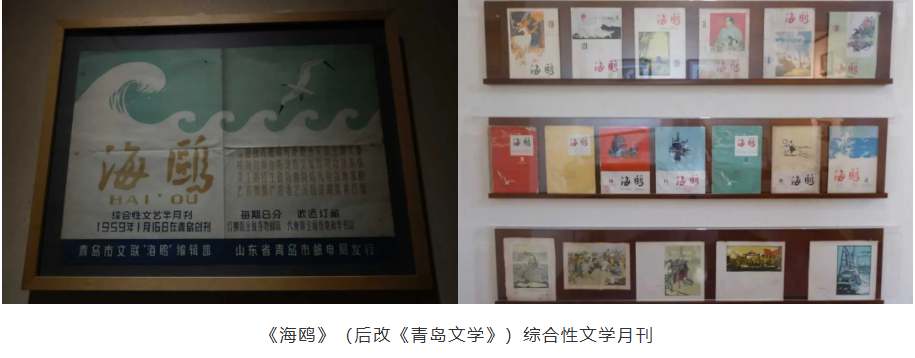 深入探索文学馆,发现独属于青岛的《海鸥》(后改《青岛文学》)这一综合性文学月刊铺满了整面文学墙。不仅如此,各种文学作品,如诗集、小说也裱在玻璃展示架上。