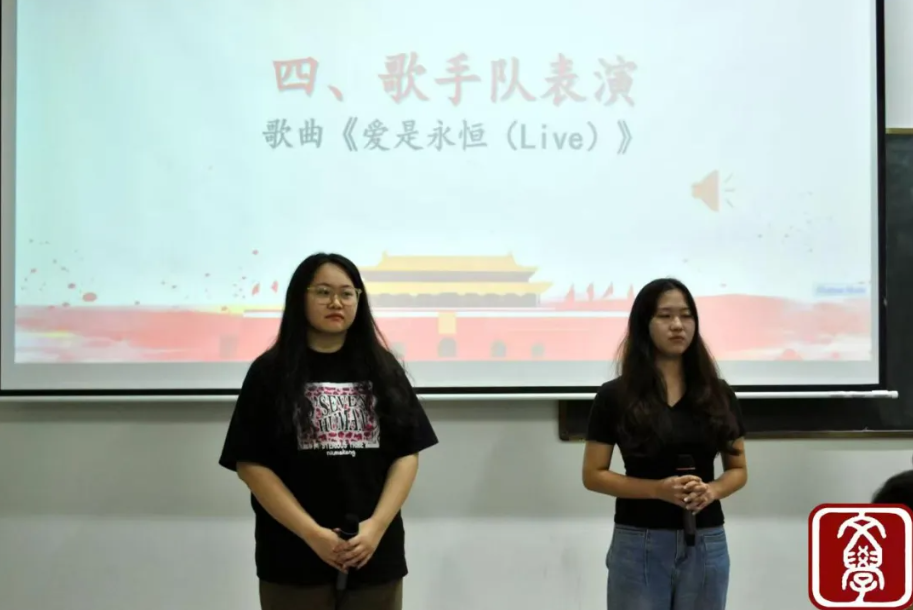 大会第四项议程,太阳网集团tcy8722艺术团歌手队带来歌曲《爱是永恒》。动人的歌声在课室响起,为现场观众带来了一场听觉盛宴,也将活动气氛推向了一个小高潮,赢得了阵阵掌声。