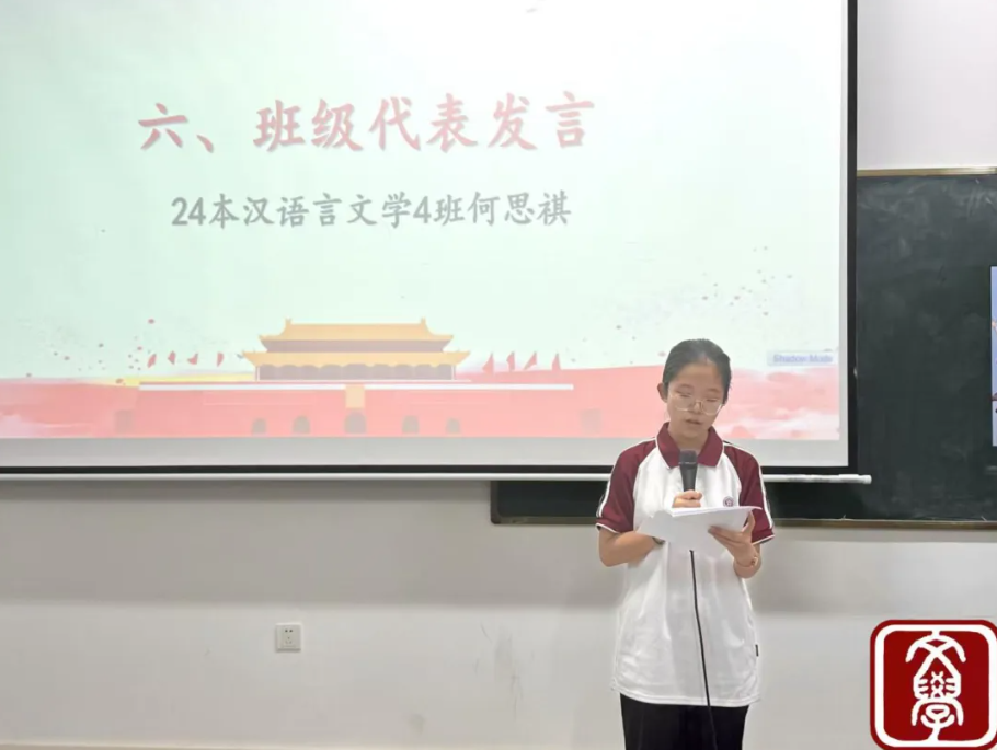 大会第六项议程,24本汉语言文学4班的何思祺同学作为班级代表上台发言。她紧扣“暖心关怀润心田,青春奋斗正当时”的活动主题,结合自身感悟畅谈青年奋斗意义,提出身处民族复兴征程中的同学们,应将关怀化为动力,以奋斗之姿奔赴未来,最终抵达青春的光明彼岸。