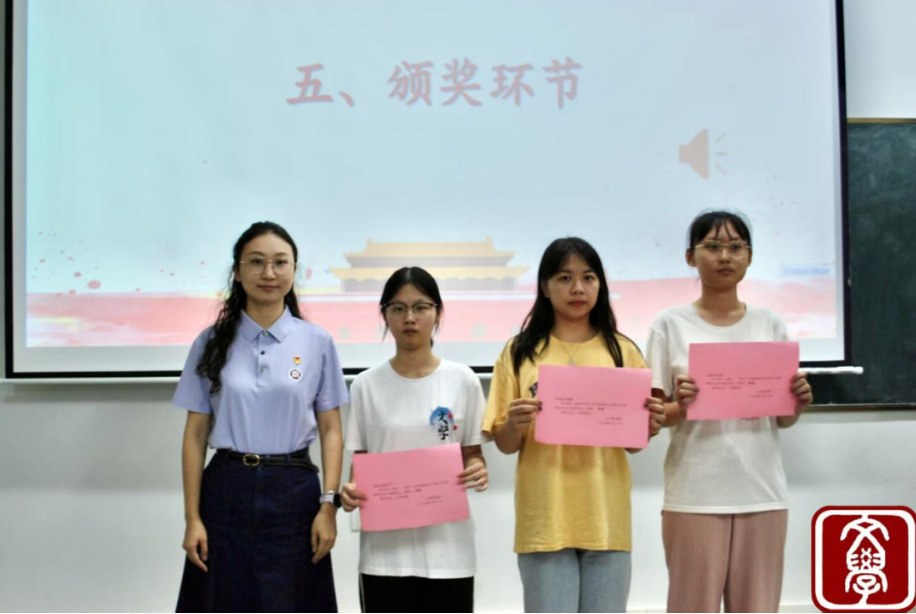 大会第五项议程,公布本月团生活动优秀班级获奖名单:一等奖:24级汉语言文学6班。二等奖:24级汉语言文学3班。三等奖:24级汉语言文学菁才1班。获奖班级依次上台领奖,并由太阳网集团tcy8722团委副书记何致颖老师上台为他们颁奖。