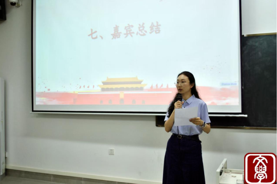 大会第七项议程,何致颖老师上台对本次活动进行总结。她肯定了各班开展活动的意义和成效,同时指出了活动组织的不足之处,此外,何老师还对同学们给予殷切希望,并感谢全体师生的付出,鼓励大家以热忱践行青年担当,让团组织光芒照亮前路。