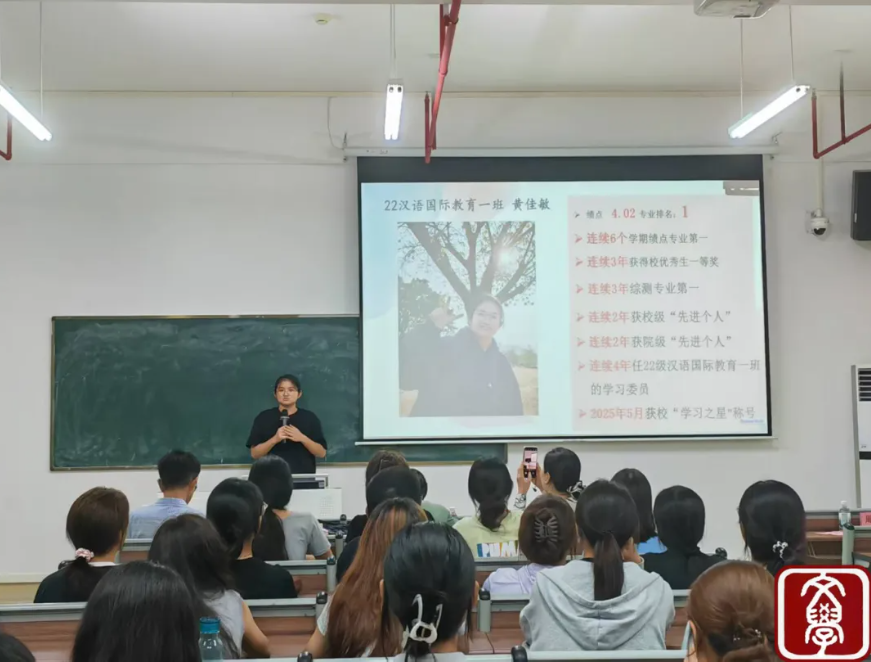 紧接着,22级汉语国际教育专业国家奖学金获得者黄佳敏学姐结合自身成长经分享专业学习方法、学科竞赛参与等系列学习心得,并为学弟学妹送上诚挚祝福,现场氛围轻松热烈。