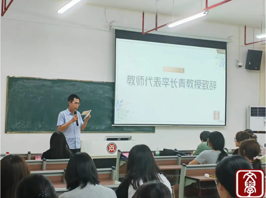 随后,教师代表李长青教授致辞。他将大学生涯比作“自助餐”,鼓励大家以高度自律规划四年时光,“不能‘饿’着度过,要通过主动汲取知识,让自己的付出都有回报”。谈及学习方法,李长青教授特别强调“读书”与“学习”的共生关系:“二者本是一体两面,哪怕暂时读不懂,也要坚持读下去。”