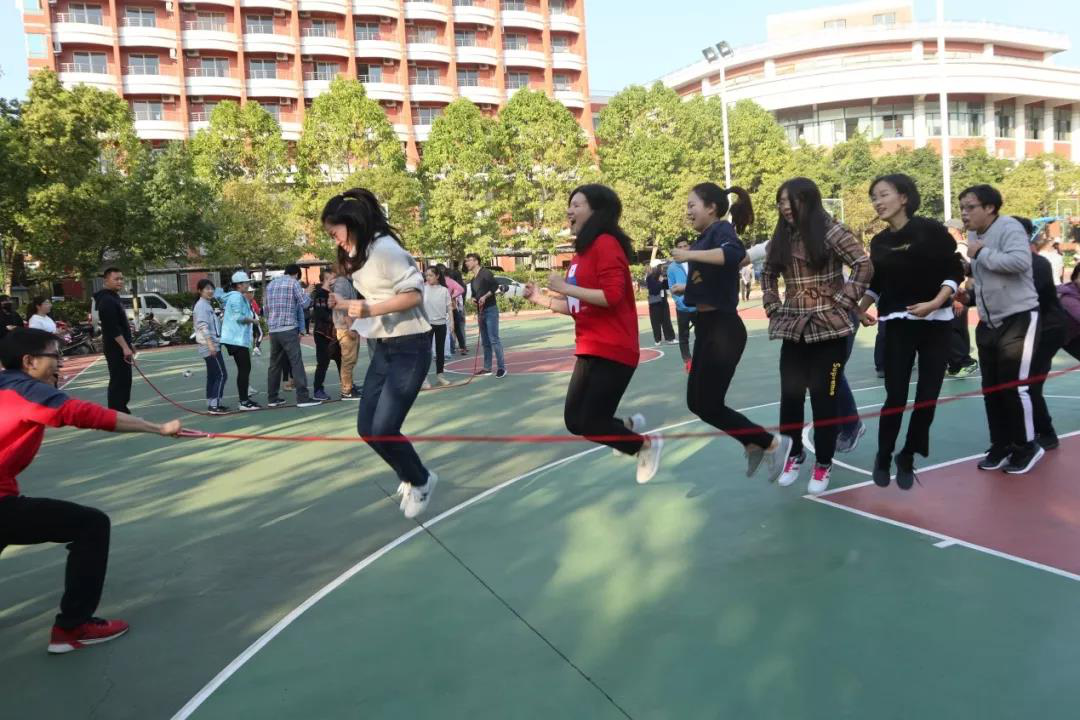 甩绳的“呼呼” 声和老师们齐声的号子融合为一体,跳跃的身姿成了这个球场最夺目的样子,笑声不断,阳光依旧明媚。