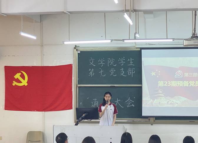 第三议题,预备党员提出转正申请。预备党员上台进行自己在一年预备期里的总结报告。在一年的预备期中能一直以正式党员的标准严格要求自己,主动了解政治,积极参与志愿活动。在思想、学习、生活、社会实践中表现良好,并正式向党组织提出转正申请。