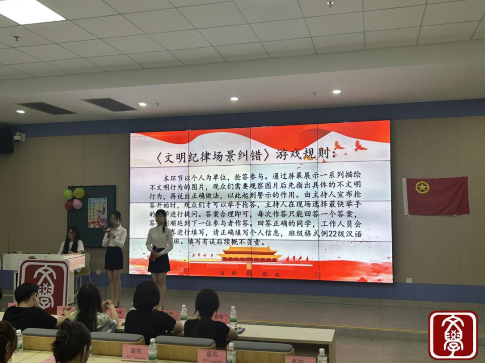 互动环节。围绕“文明与纪律”主题进行有奖问答游戏,让同学们对文明的认识更加深刻,更好地将文明精神融入生活。