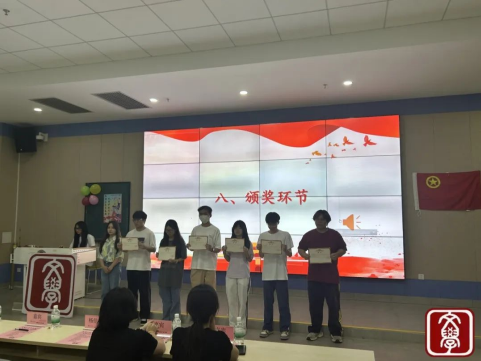 颁奖环节。对四月团生活动表现优异的班级一等奖23级汉语言文学16班,24级汉语言文学4班 ,二等奖23级汉语言文学3班,24级汉语言文学6班,三等奖23级汉语言文学14班24级汉语言文学3班,进行了表彰,并由杨佳林老师为获奖代表颁发荣誉证书,以此激励各团支部积极进取、再创佳绩。工作人员为他们合影留念!