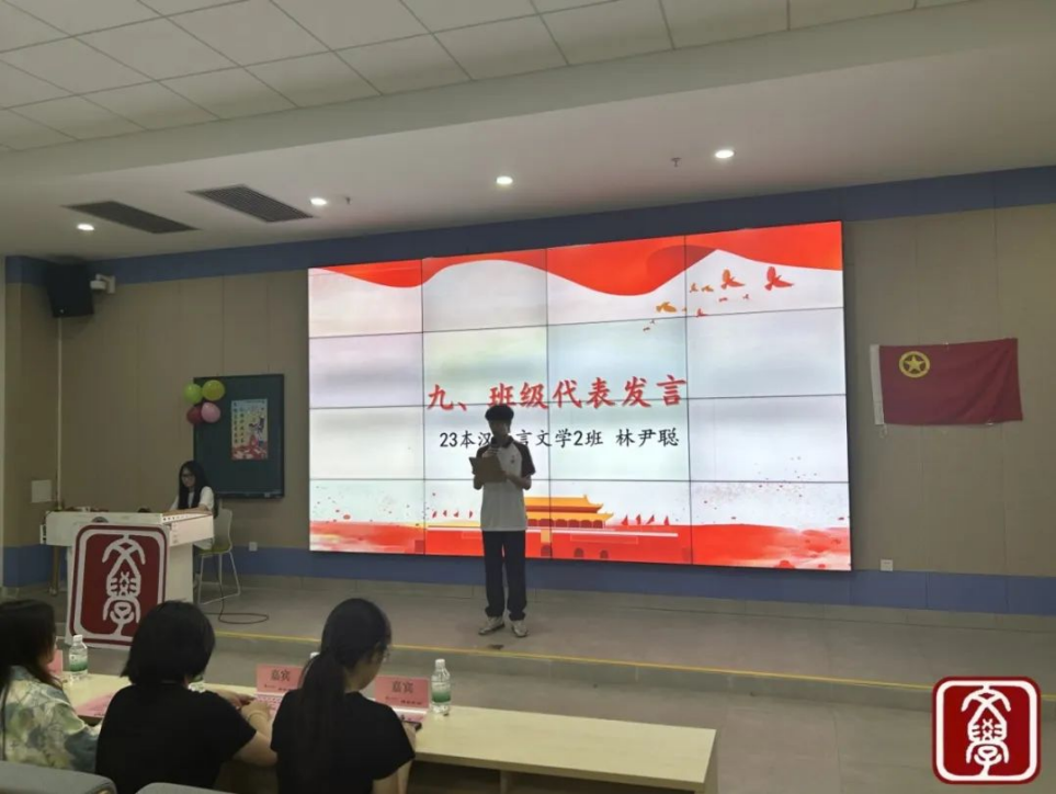 经验分享环节。表现突出的班级代表23级汉语言文学2班林尹聪同学 上台,分享团生活动组织过程中的宝贵经验。他总结本月团生活动为“一次思想洗礼与心灵触动”,分享了自己的感悟,并剖析文明精神的内涵,他呼吁同学们在纪律的护航中奔赴山海,争做文明火种的传递者。