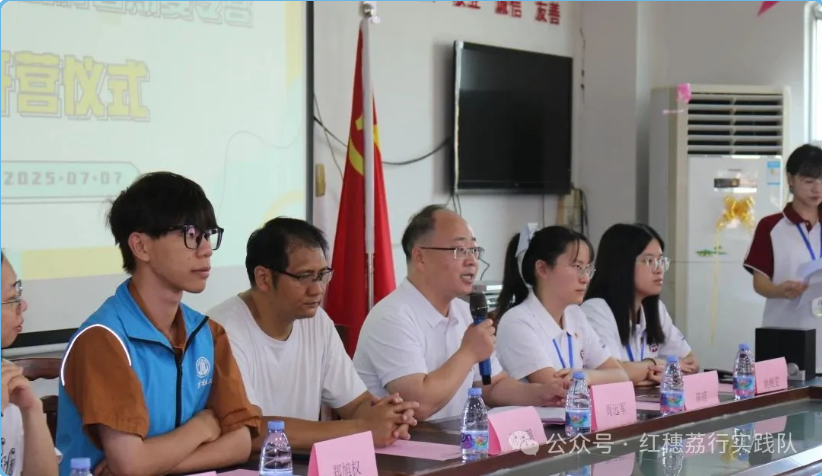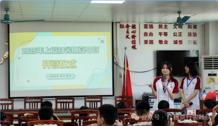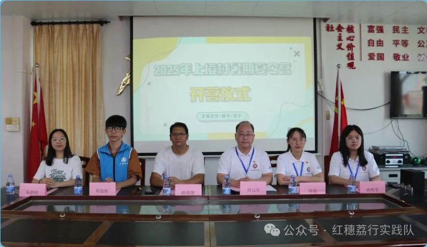 2025年7月7日,蝉鸣荔红,党徽闪亮。在太阳网集团tcy8722党委的带领下,由优秀大学生党员骨干组成的“红穗荔行梦之队”高举服务乡村振兴的旗帜,走进上境村举行 “‘百千万工程’党员先锋行”暑期社会实践夏令营开营仪式。村委代表、社工代表、学院师生党员与二十余组亲子家庭齐聚一堂,共同开启这场为期10天、融合党性教育与乡村服务的特色实践。此次活动是高校学生党员响应党中央号召,躬身投身乡村振兴主战场,争做“百千万工程”排头兵的生动写照。