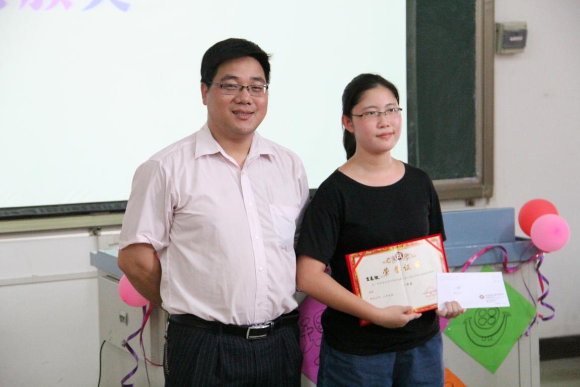 优秀奖分别是5号14汉语言文学3班左薇薇、6号14本会5班郑雅方、12号14广告2班张宇慧、15号14广告1班陆翩翩、19号13汉语言文学2班谢绮珊、20号14新闻2班黄子盈,由经济系心康指导老师封雪霏老师和会计学院心康指导老师刘泽老师颁奖。三等奖分别是1号14本会28班蔡小燕、17号14人力2班苏翠诗、18号13本金融工程2班纪琳影,由文学系张继荣副主任颁奖。二等奖分别是7号12环艺3班黄芷茵、11号14市场营销3班邓燕丹,由外语系学工陈少鸿副主任颁奖。