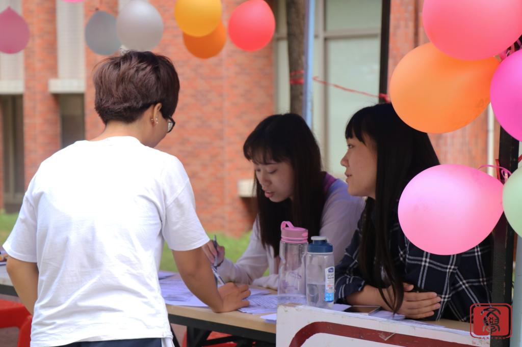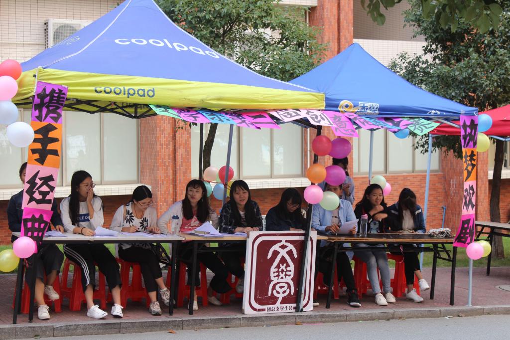 深秋的风夹杂着些许寒意,但是天气依然挡不住同学们渴望一展才华的热情。2017年10月21日上午九点,摊位前便已挤满了前来咨询报名的同学。工作人员们热情耐心地向他们介绍活动详情并引导他们报名。当然,除摊位外,其他工作人员也积极分布在校道各处进行活动宣传。