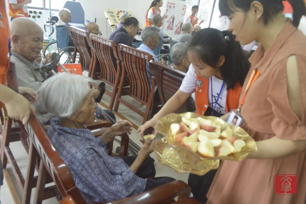 首先,志愿者向老人们表演强身健体的手指操,并耐心带领他们将手指动起来。接着,表演的节目是小品,老爷爷老奶奶们一边吃着志愿者们送来的爱心水果,一边观赏着小品,看得老人们不亦乐乎。接下来,志愿者为老人们带来了歌声《万水千山总是情》,更好地带动了现场的氛围。