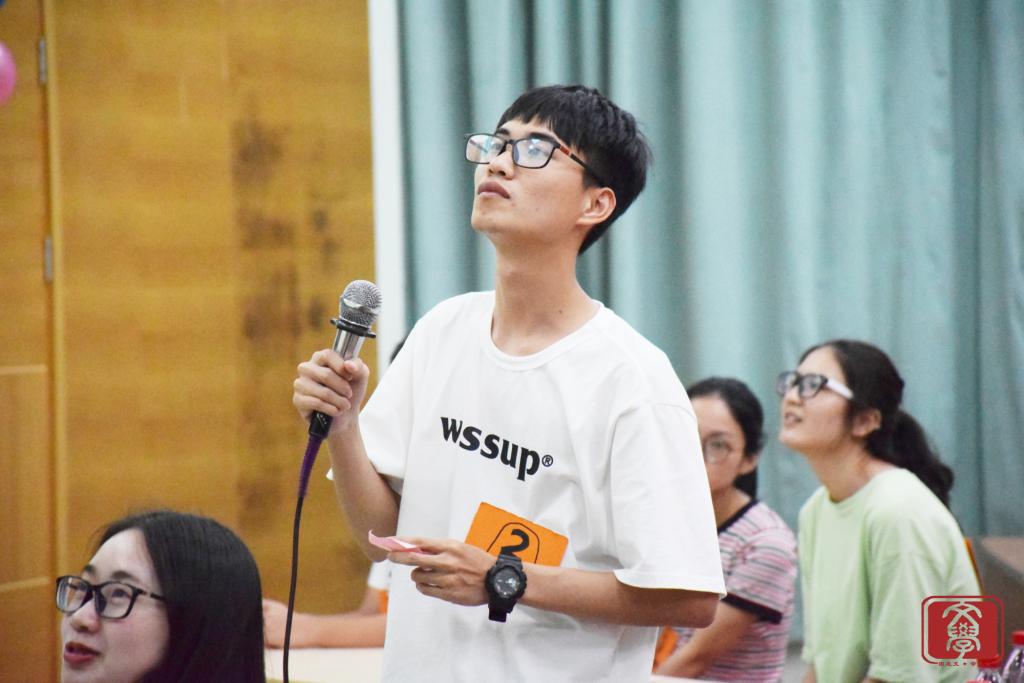 紧张的比赛到这里便告一段落,接下来是观众互动。题目一出,各个观众摩拳擦掌,跃跃欲试,调动全场的氛围。回答对的同学也获得了一份精美的奖品。