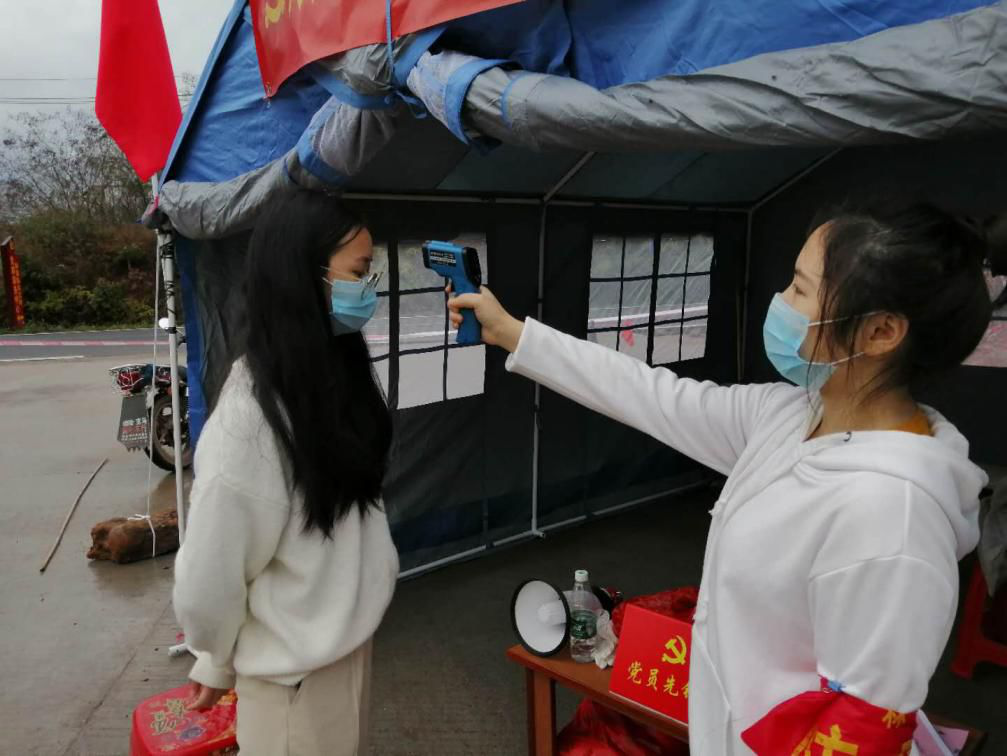 陈晓晴同学在防疫工作点的主要工作内容是:驻守在村口,负责拦截外村人员入村以及对本村村民进出时测量体温。