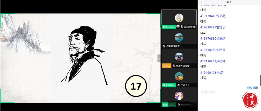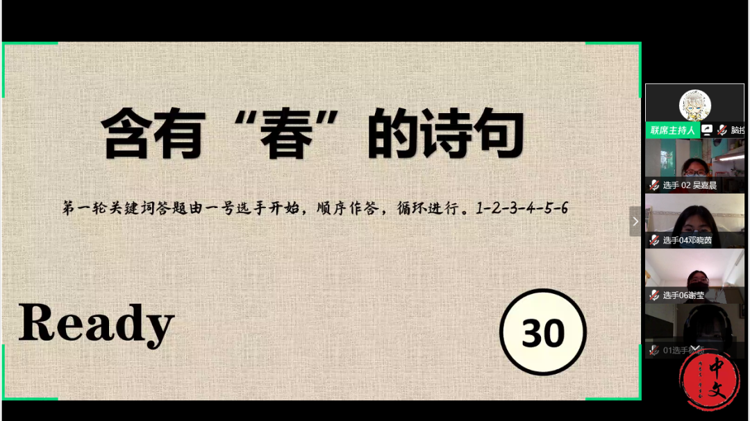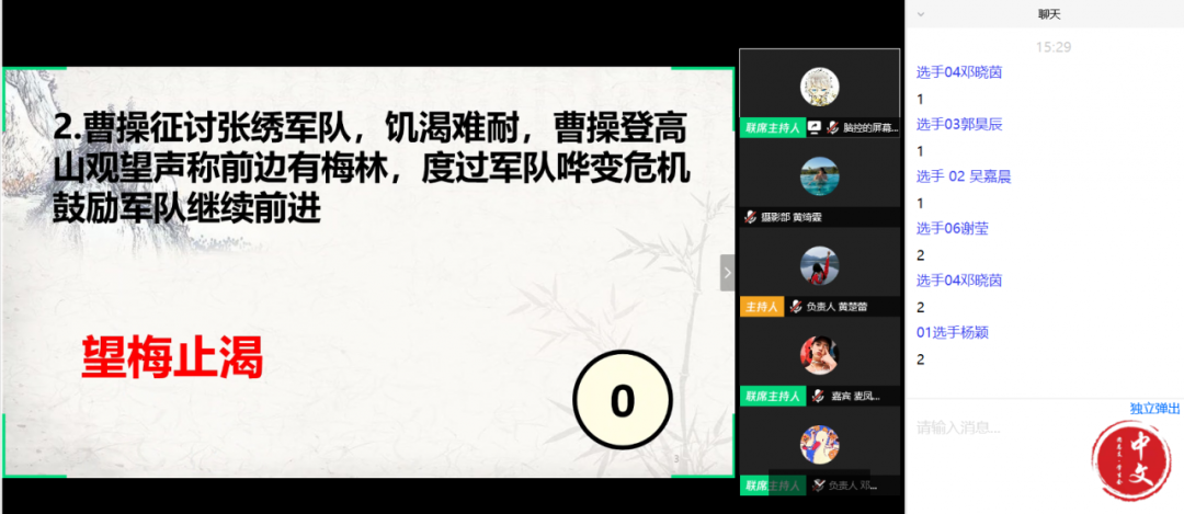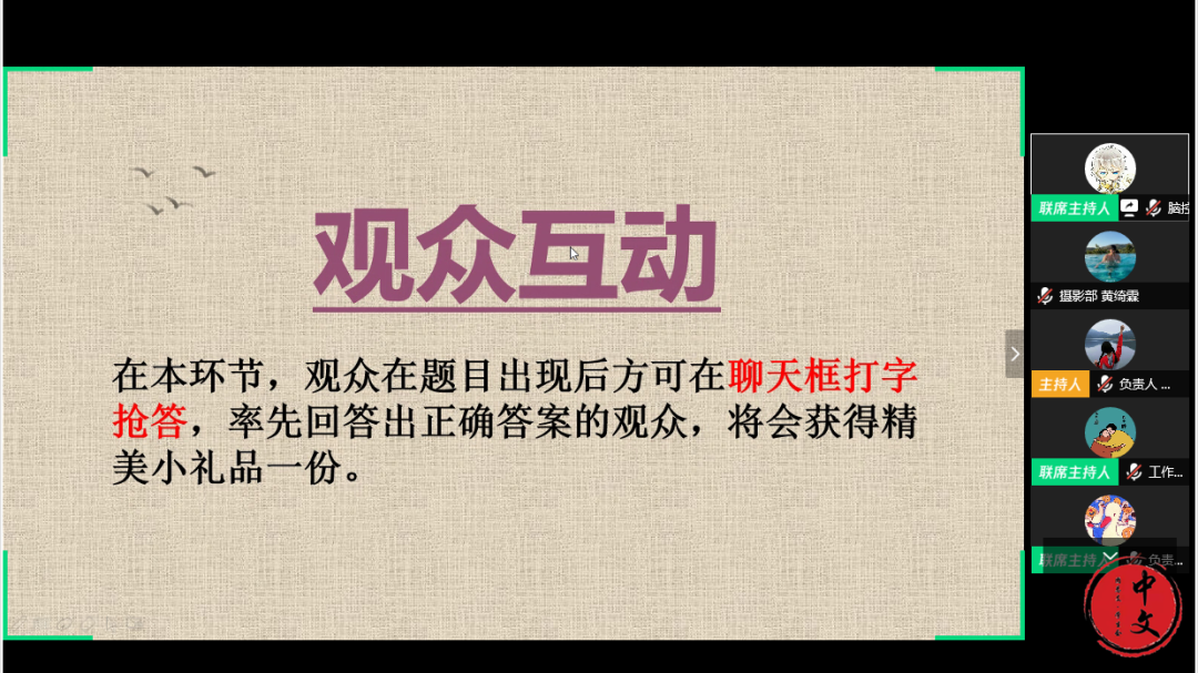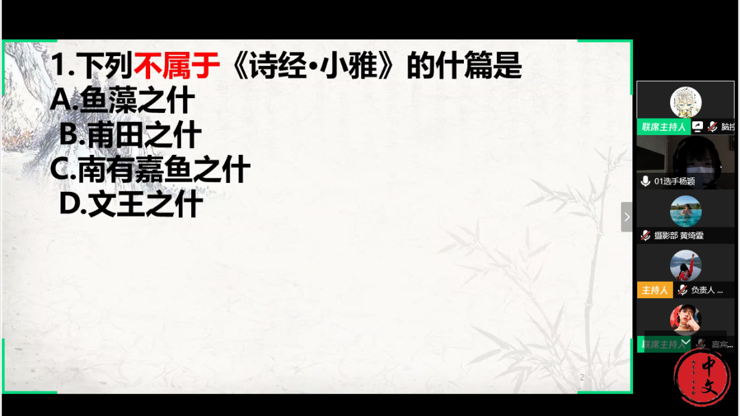 4月21日下午三点,第九届科技学术节之第四届“墨痕书香”国学知识竞赛的决赛于腾讯会议准时举行。莅临本次大赛的嘉宾有:中文系团总支书记兼学生会指导老师何嘉鸿老师,中文系团总支副书记罗宇雯,中文系学生会主席麦凤莹,中文系学生会副主席谢淩炜,中文系学生会副主席华丽雯,中文系学生会副主席冯海瑶,中文系学生会秘书长黄鉴洲。