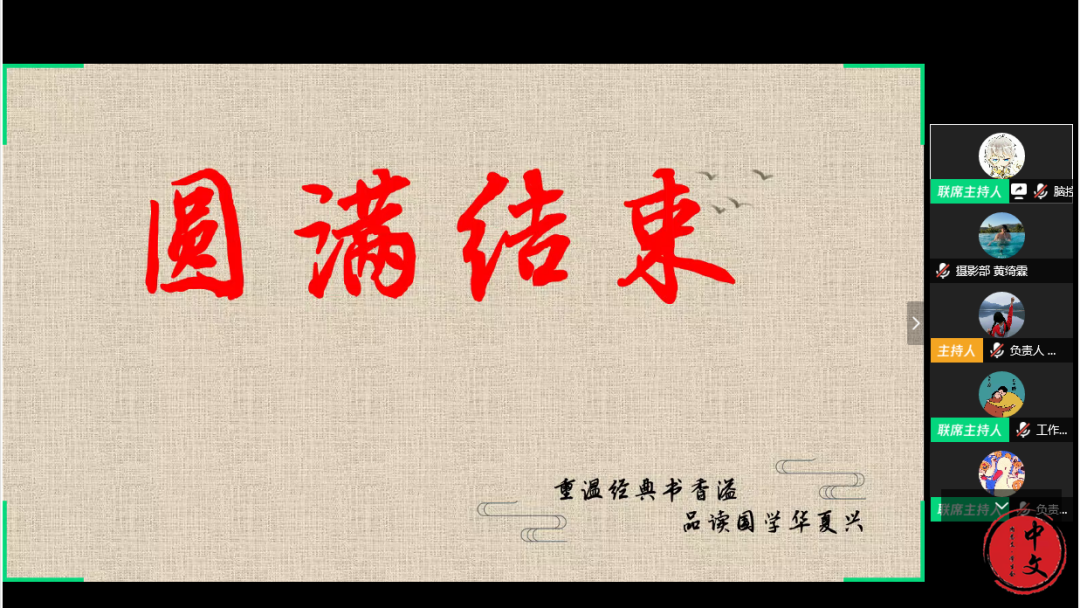 至此,本次国学知识竞赛圆满结束。继承并发扬国学,不是一朝一夕的事,希望同学们能在本次国学知识竞赛中领略国学之美,让这股跨越千古的风韵永远地流传下去。
