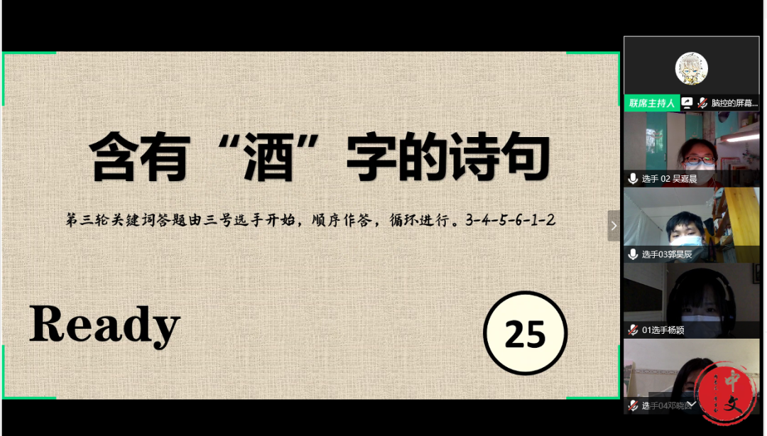 紧接着进入第三环节“飞花令”,以车轮战的形式要求选手回答包含关键词的诗句。比赛进入白热化阶段,选手们使出浑身解数,一句又一句脍炙人口的诗词自他们口中道出。最后,3号选手郭昊辰同学力压群雄,连胜三场。国学底蕴之深厚,一览无余。
