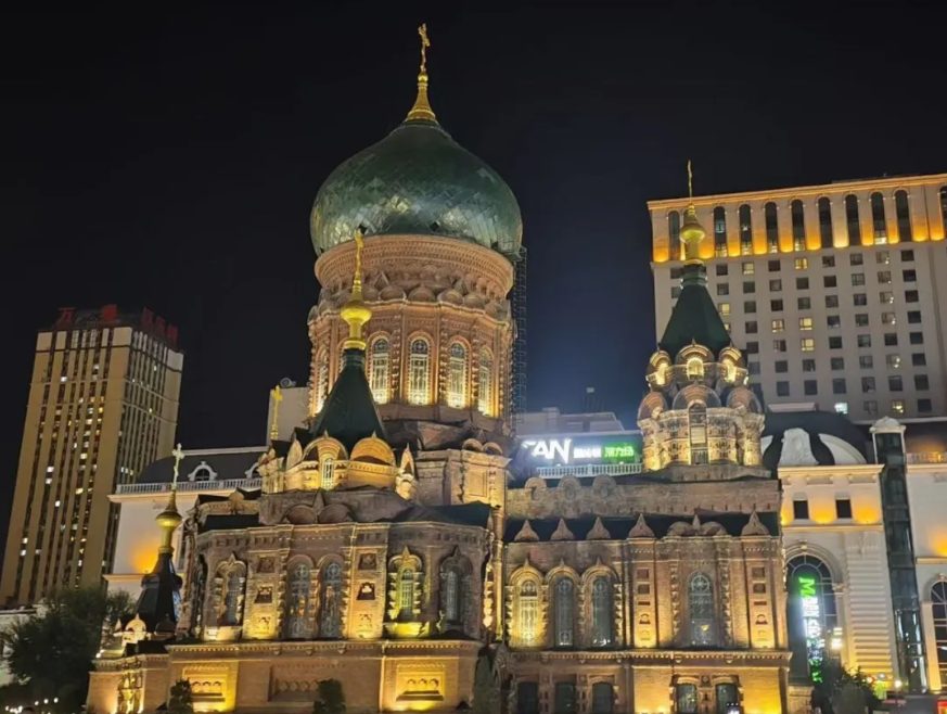 到了夜晚,太阳落下,月亮升起,洒下柔和的银光。我们走向圣索菲亚教堂——它就像一本立体的历史书,静静站在夜空下。教堂的每一处建筑细节,仿佛都藏着故事。墨绿的穹顶与浑厚的红砖墙体,勾勒出浓郁的俄式风情,见证着这座城市的早年岁月;阳光从穹顶周围的拱窗洒落时,如同神圣的光芒,让人想起文学中描绘的天国之光。红砖墙上的十字花纹和凤凰浮雕,既刻着旧时俄侨的乡愁,也呼应着圣经中关于复活与希望的预言。这座建筑从最初的东正教堂,到后来成为展示城市历史的建筑艺术馆,如同被时光多次书写的手稿。它不用言语,却本身就是一首充满历史和诗意的长诗。