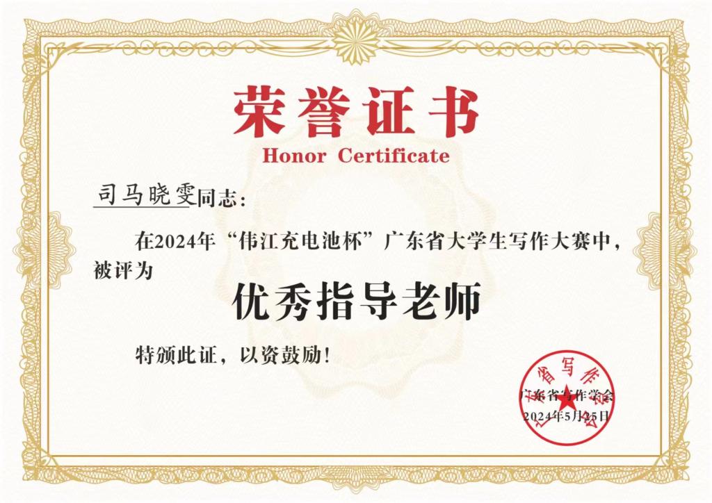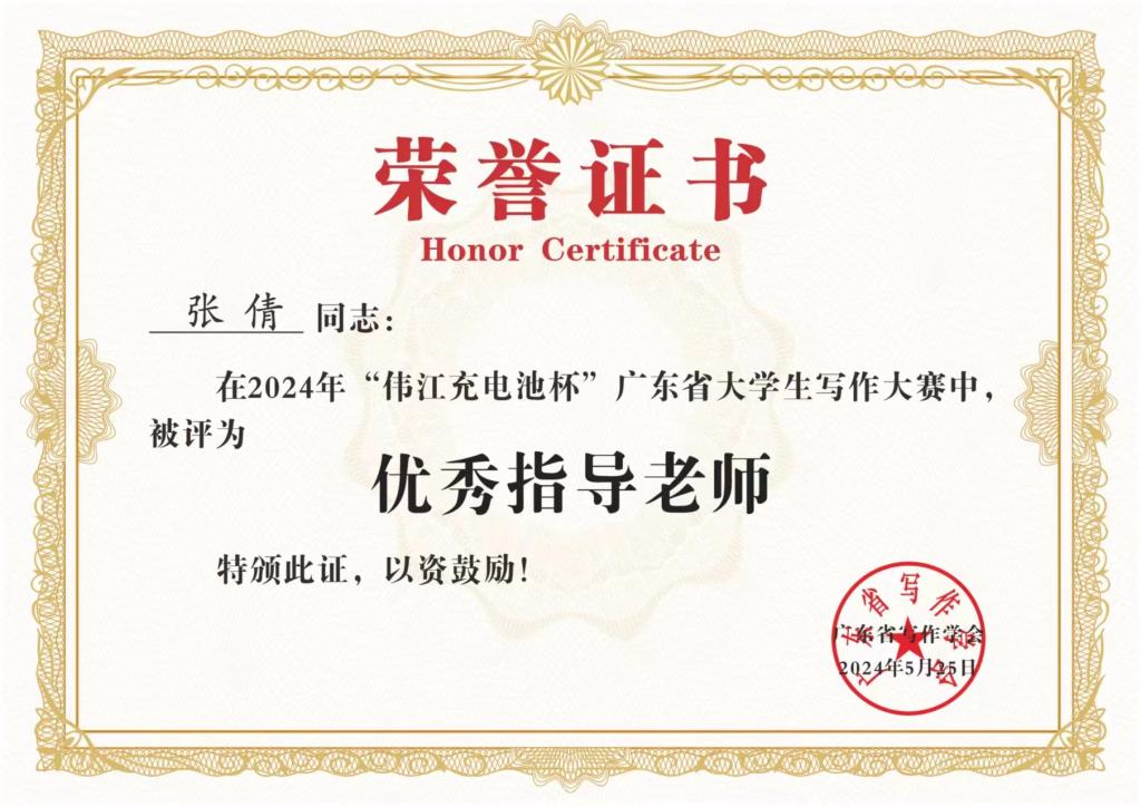 学子的佳绩,离不开老师的谆谆教诲,让我们感谢在此次广东省大学生写作大赛中为学子提供指导的各位老师,助力我校热爱文学创作学子踏上自己的文学之旅。也让我们恭喜我校五位教师在本次大赛中获得“优秀指导老师”称号!