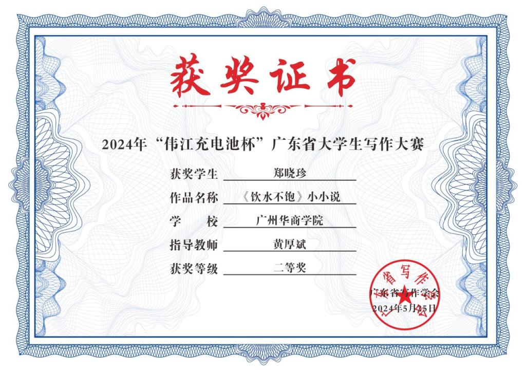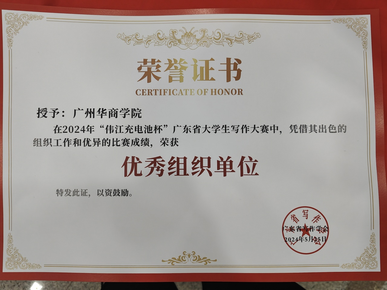 在我校学子对文学创作的长期坚持和各位指导老师的潜心研究、耐心教学下,我校也在本次大赛中取得优异成果,被授予“优秀组织单位”称号,荣获“广东省写作学会教学成果奖”二等奖!
