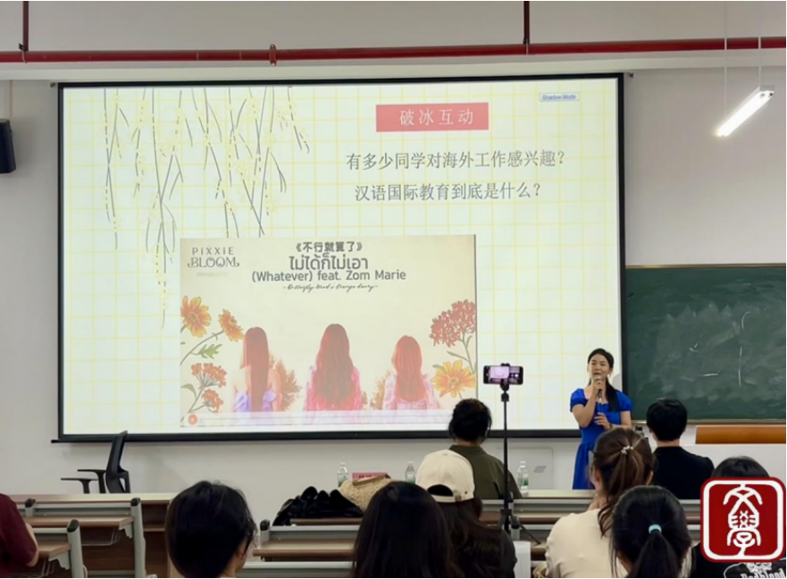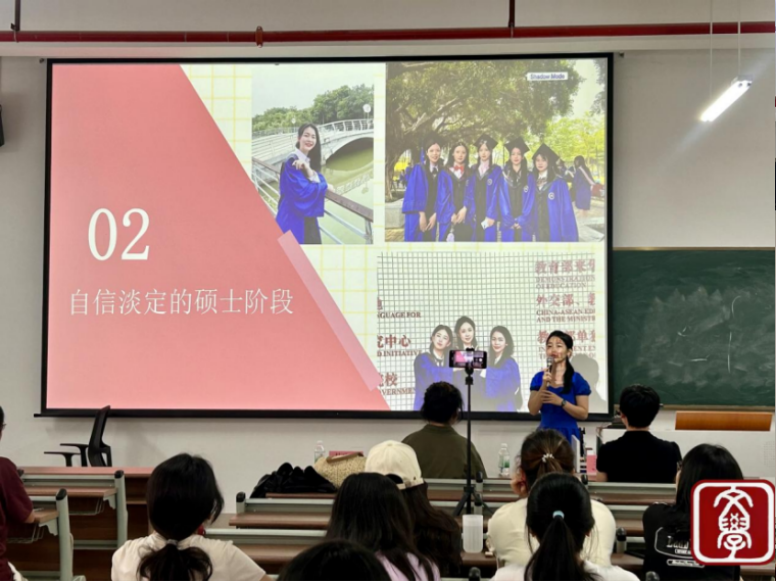 分享硕士阶段生活。在“自信淡定”的硕士阶段,林珍兰师姐分享了她读研时期学习和生活的点点滴滴,包括导师的选择、读研项目的研究等,并在读研时期通过了层层筛选成为了赴泰汉语教学志愿者,开启了在泰国的汉语教学生活。