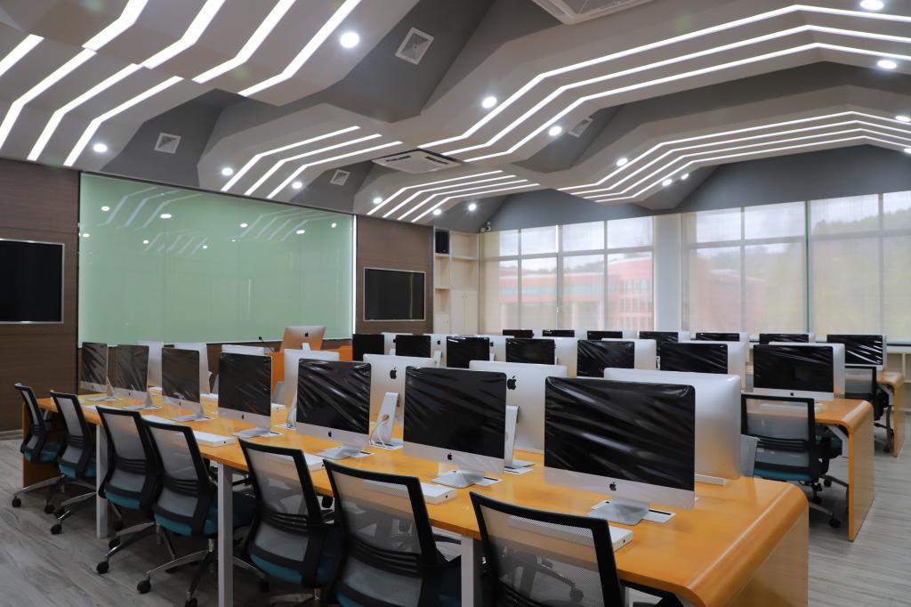 在我们正在为这三间实验室所配备的设备所惊叹时,曾志区副主任带领我们来到最后的网络资源制作实验室和新媒体研究实验室。实验室采用苹果工作站的装修风格,中间有着一扇门隔着。当我们表示对这一扇门的作用存疑时,尹康庄副院长为我们解惑:这一扇门是活动门,它可开可合。在学生人数少的情况下,会关闭这一扇门,做到资源节约;在学生人数多的情况下,会开启这扇门,容纳多一倍人数,而且透明的玻璃墙设计也能给同学们带来连通感。这间实验室所配备的学生用机也不是普通教室所能比较的,苹果MAC台式一体机整齐划一地摆放在教室中。曾志区副主任表示后期学院会为这些台式一体机配备正版软件,这些软件均从苹果商店中购得。
