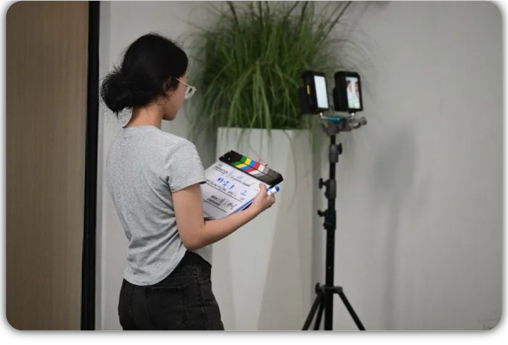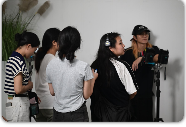 在此次所探访的剧组中,有两位来自编导班的同学正以实习生的身份深度参与其中,分别是 许楚同学担任剧组场记,负责记录镜头起止、景别变化及演员台词动作等拍摄细节。丁锦华同学担任美术指导助理,协助剧场置景、复景,根据剧本制作戏用道具。