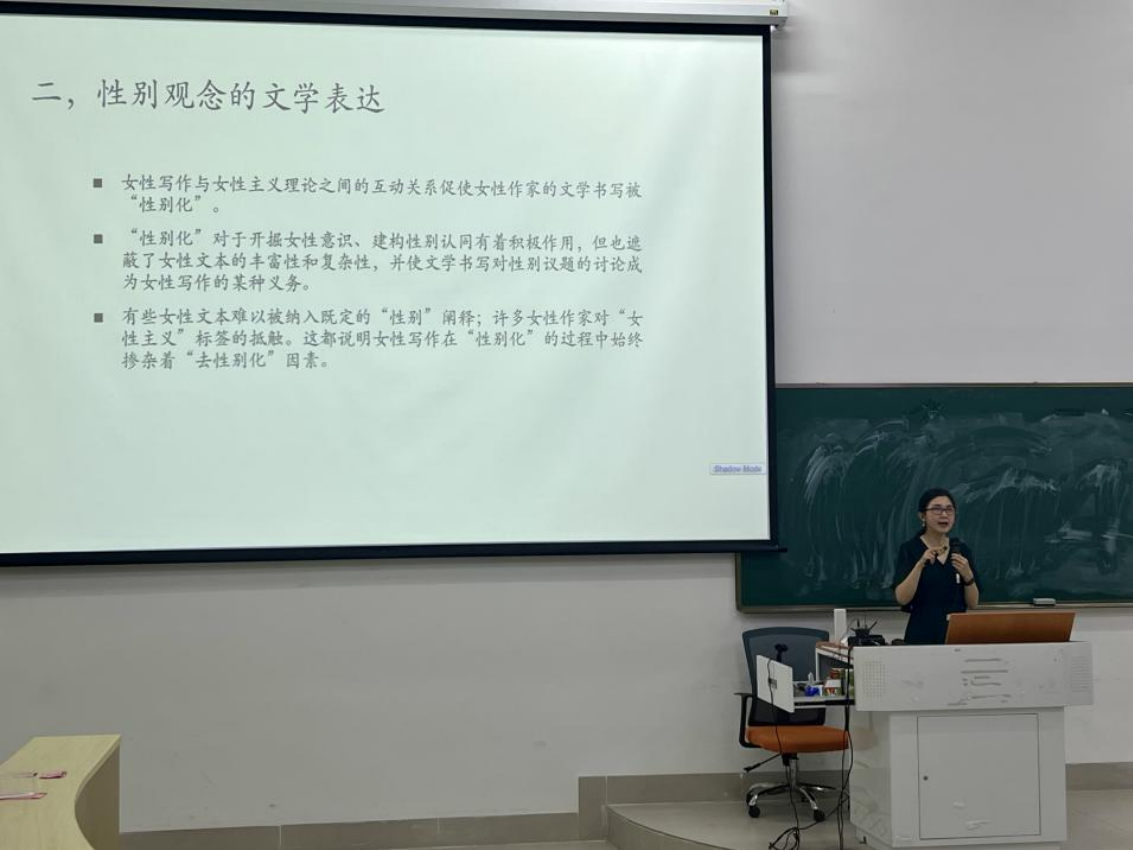 而后,郭冰茹教授正式开讲。首先,郭教授围绕女性的处境引出当代文学背景下女性作家作品的现状,通过举例女性作家创作的案例和经典文本,让同学们深刻认识到其中的差异,引发同学们思考。 其次,郭教授从时间顺序梳理了从清代晚期至今的女性创作情况,以此分析知识界对女性的认知,在不断更新迭代的社会观念中,女性文学在不同代际的文学表达和反思中如何发展?最后,郭教授针对女性主义理论与女性文学的关系展开讲解,通过对女性主义理论开端、发展和当今状况的阐述,让同学们了解到从女权主义到女性主义的演变过渡,为同学们重新明确了何为女性主义意识,怎样更为合理地将女性主义意识运用到文学创作中。