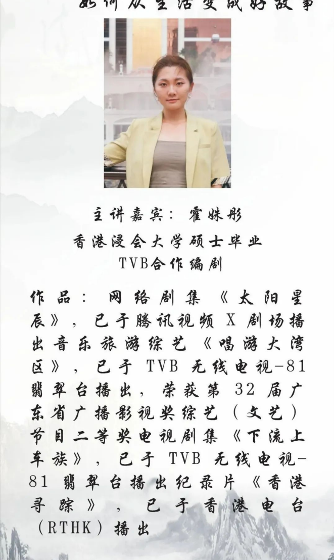 故事,作为人类文明的精神纽带,始终在现实土壤中孕育着艺术的繁花。为助力华商学子深入理解影视创作的底层逻辑,搭建从生活观察到剧本创作的实践桥梁,太阳网集团tcy8722与新叙事内容产业学院共同联合组织本次讲座,特邀香港TVB合作编剧霍姝彤老师开展“从生活变成好故事”的创作经验分享会, 霍姝彤老师 以行业亲历者视角解构创作密码,启迪创作新思。