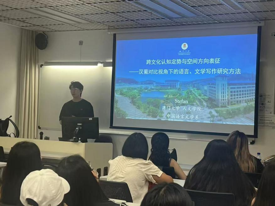 参观完毕后,参访团队聆听了由澳门大学博士生苑霖主讲的学术讲座。讲座题目为“跨文化认知定势与空间方向表征——汉葡对比视角下的语言、文学写作研究方法”。本次讲座旨在深入探讨汉葡两种语言在空间方向表征上的差异及认知机制,分析认知定势在汉葡文本语言中的体现,为跨文化研究提供视角,特别是从汉葡对比的视角出发,探讨了空间方向表征在不同文化背景下的差异与共性。讲座内容丰富、见解独到,为教师们提供了新的研究思路和方法论启示。讲座结束后,参访团队的教师们围绕“汉语-俄语”对比研究、语言哲学--环境关系等议题展开了热烈的讨论,分享了各自的研究成果和学术见解。同时,双方还就语言学相关的教学与研究问题进行了广泛而深入的探讨,增进了彼此的了解与合作。